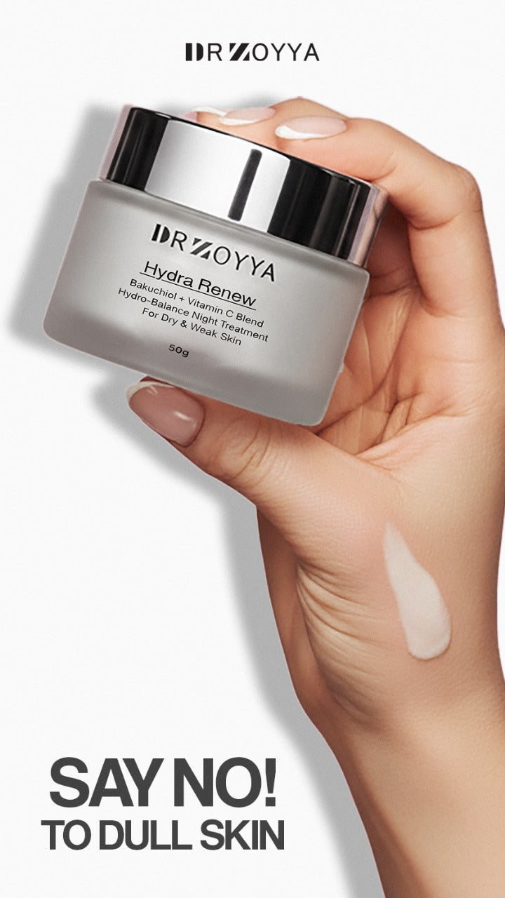 Dr.Zoyya Hydra Renew Cream (50g) is a Hydra-Balance Night Treatment designed to brighten, hydrate, and nourish your skin. Enriched with Bakuchiol, Hyaluronic Acid, Vitamin E, and Shea Butter, it locks in moisture, restores skin balance, and gives a natural radiant glow.